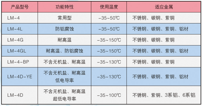 LM-4系列冰河冷媒具有低毒,不易燃,比熱大,安全穩(wěn)定,載冷能力強等優(yōu)點。對碳鋼、不銹鋼、紫銅等金屬防銹性能優(yōu)良。在不同濃度條件下,可以在很寬的溫度范圍內(nèi),廣泛應(yīng)用于各種制冷系統(tǒng)。使用時,根據(jù)具體工藝溫度要求單獨使用或用水稀釋成適當(dāng)濃度后應(yīng)用。如與醇類載冷劑混合使用,應(yīng)加入適量的冰河冷媒增效劑。其中: