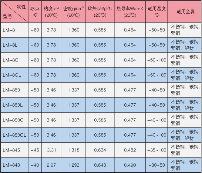 LM-8系列冰河冷媒由改性有機(jī)酸鹽構(gòu)成,主要添加劑包括防腐蝕劑,防霉劑,增溶劑,穩(wěn)定劑等。外觀為淺色液體,沸點(diǎn)高于105℃,不易揮發(fā),無閃點(diǎn),不可燃,低毒。