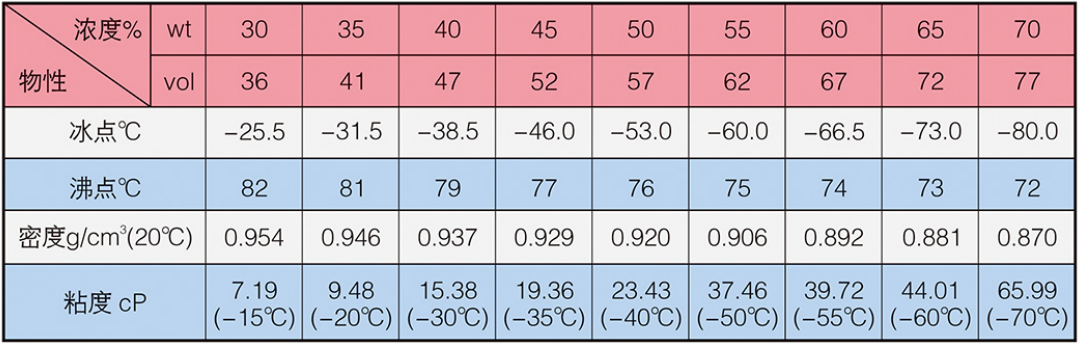 LM-1型冰河冷媒由一元醇改性構(gòu)成,主要添加劑包括防腐蝕劑,防霉劑,增溶劑等。外觀為淺色液體。20℃時(shí),原液密度為0.850~0.860g/cm°,粘度為1.25mPa·s(cP),比熱為0.603ca/g:℃熱導(dǎo)率為0.26W/m·K。沸點(diǎn)高于60℃,冰點(diǎn)低于-100℃,閃點(diǎn)為16℃。