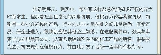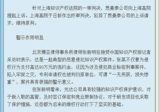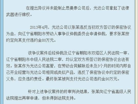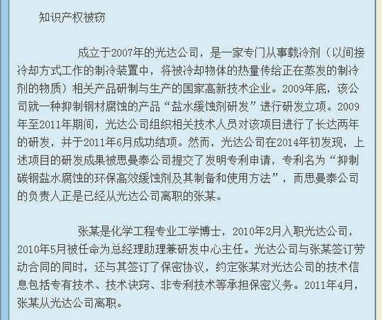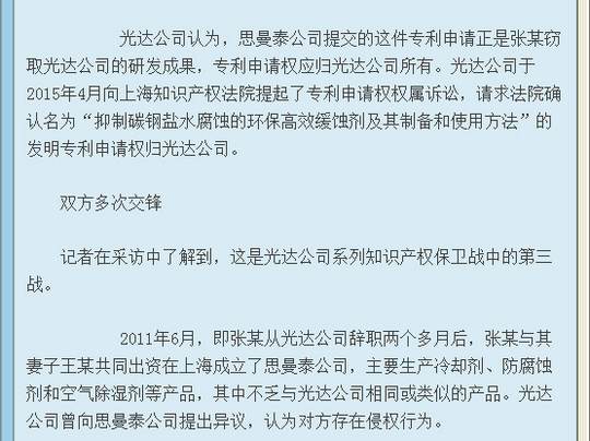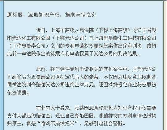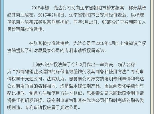近日,上海市高級(jí)人民法院(下稱上海高院)對(duì)遼寧省朝陽(yáng)光達(dá)化工有限公司(下稱光達(dá)公司)與上海思曼泰化工科技有限公司(下稱思曼泰公司)之間的專利申請(qǐng)權(quán)權(quán)屬糾紛案作出終審判決,維持此前一審法院作出的涉案專利申請(qǐng)權(quán)屬于光達(dá)公司的判決結(jié)果。在與這件專利申請(qǐng)相關(guān)的其他案件中,原為光達(dá)公司高管后為思曼泰公司原法定代表人的張某,不僅因?yàn)檫`反競(jìng)業(yè)限制合同被法院判令其賠償光達(dá)公司違約金80萬(wàn)元,還因涉嫌侵犯商業(yè)秘密罪被依法逮捕。光達(dá)公司不認(rèn)可法院判決,又在遼寧省朝陽(yáng)市雙塔區(qū)人民法院進(jìn)行上訴,在2017年8月30日開(kāi)庭,判決結(jié)果如下: